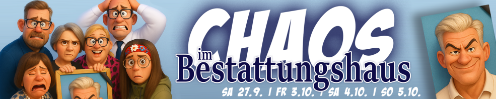 wir freuen uns, dass Sie den Weg in unseren Ticketshop gefunden haben. Derzeit laufen die Proben auf Hochtouren und mit großem Elan. Die Tickets für unser Theaterstück “Chaos im Bestattungshaus” gibt es bald hier ab dem 29.08.2025 zu Kaufen!